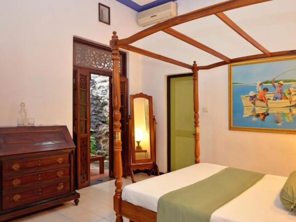 Antique Furnishings: Rooms are adorned with elegant antique furniture, including four-poster beds, creating a blend of modern luxury and classic charm.